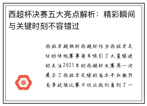 西超杯决赛五大亮点解析:精彩瞬间与关键时刻不容错过